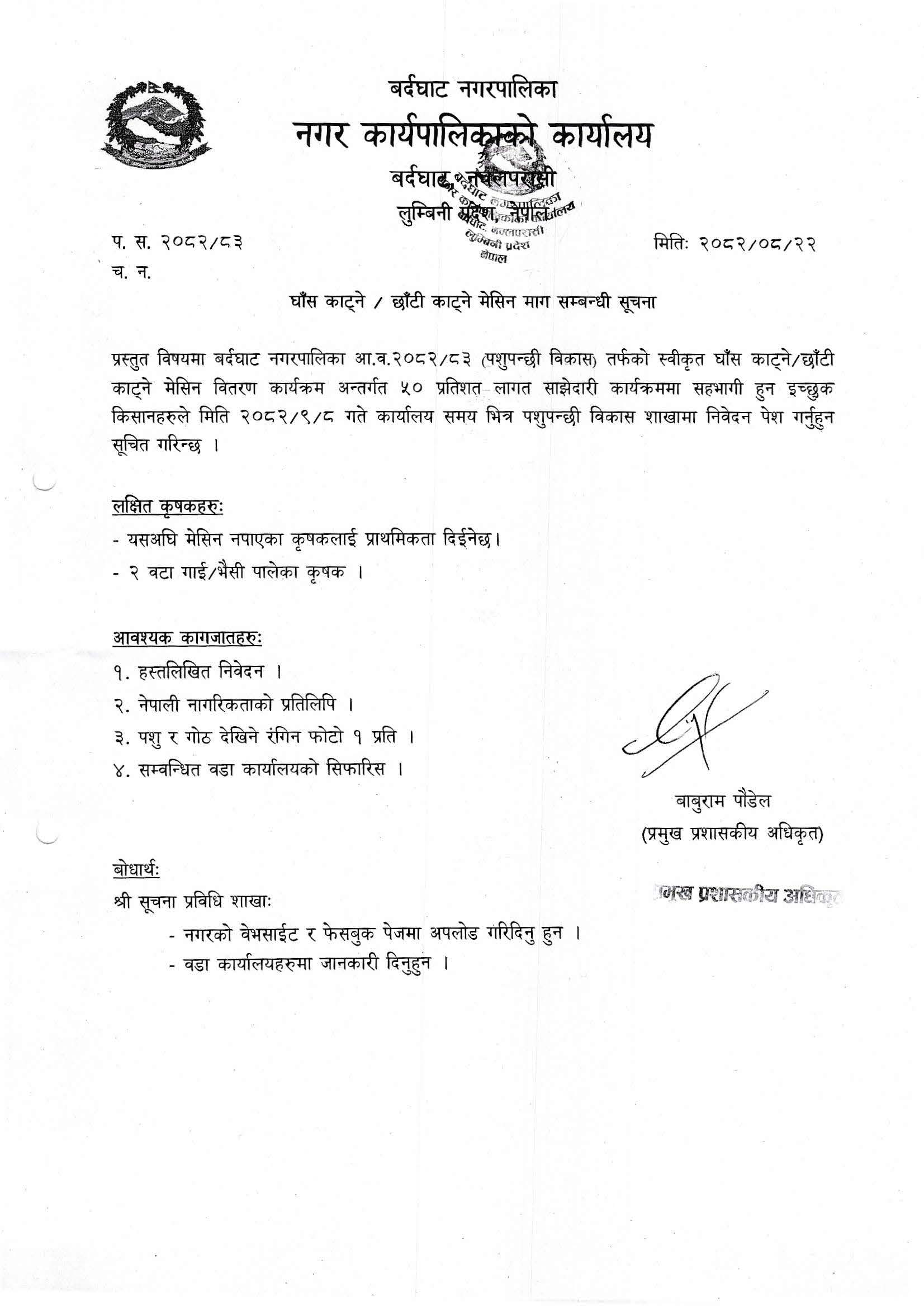 घाँस काट्‌ने / छाँटी काट्‌ने मेसिन माग सम्बन्धी सूचना