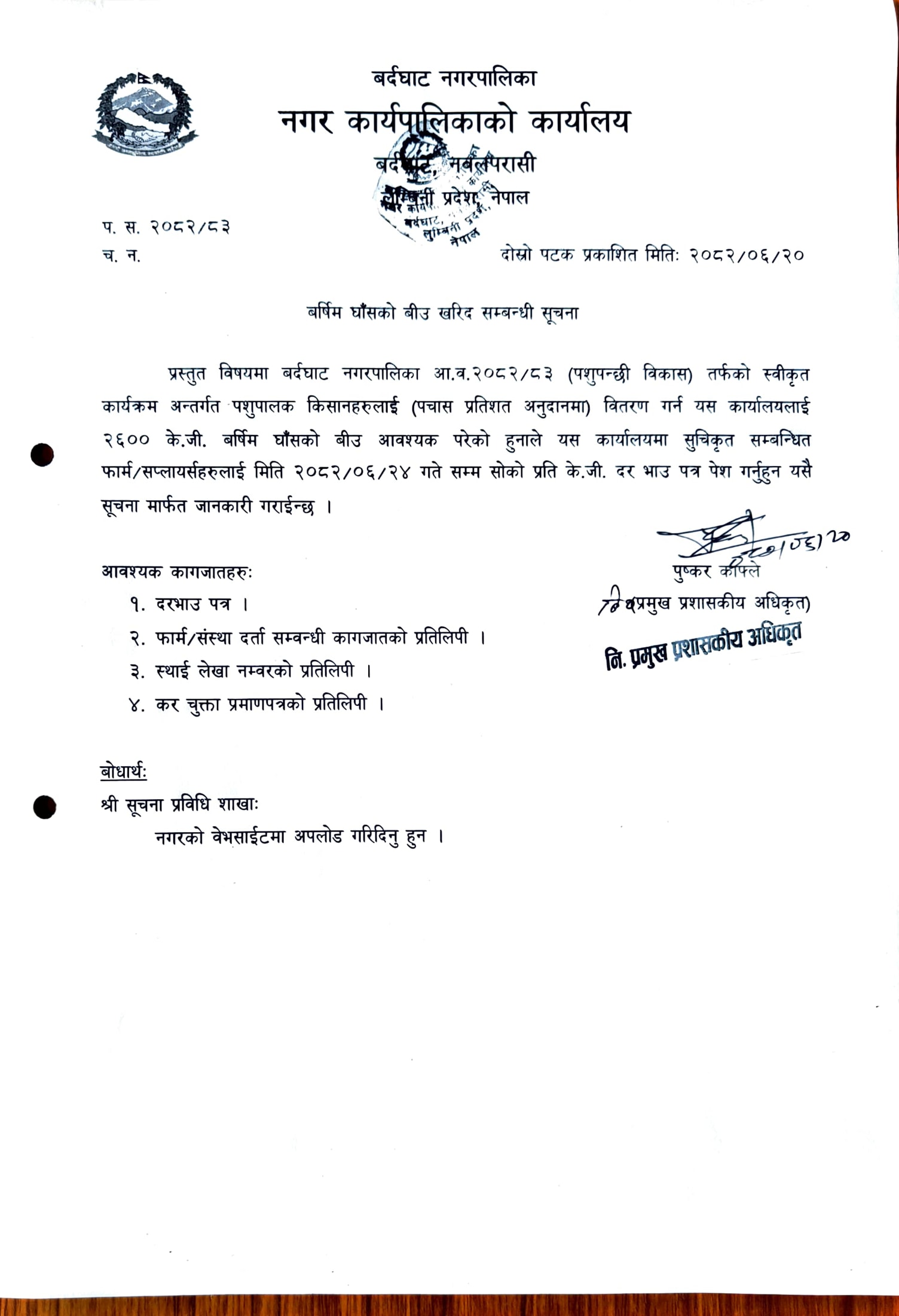 बर्षिम घाँसको बीउ खरिद सम्बन्धी सूचना (दोस्रो पटक प्रकाशित)
