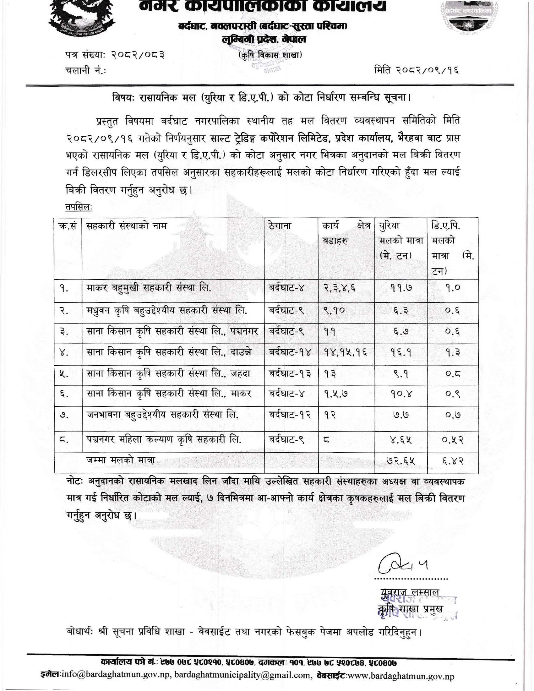 रासायनिक मल (युरिया र डि.ए.पी.) को कोटा निर्धारण बारे सूचना