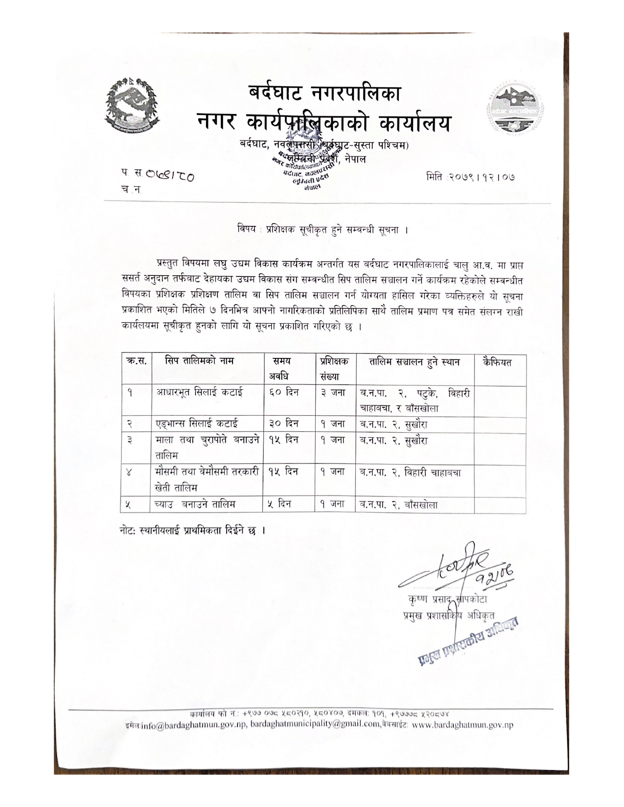 प्रशिक्षक सुचिकृत सुने सम्बन्धी सूचना