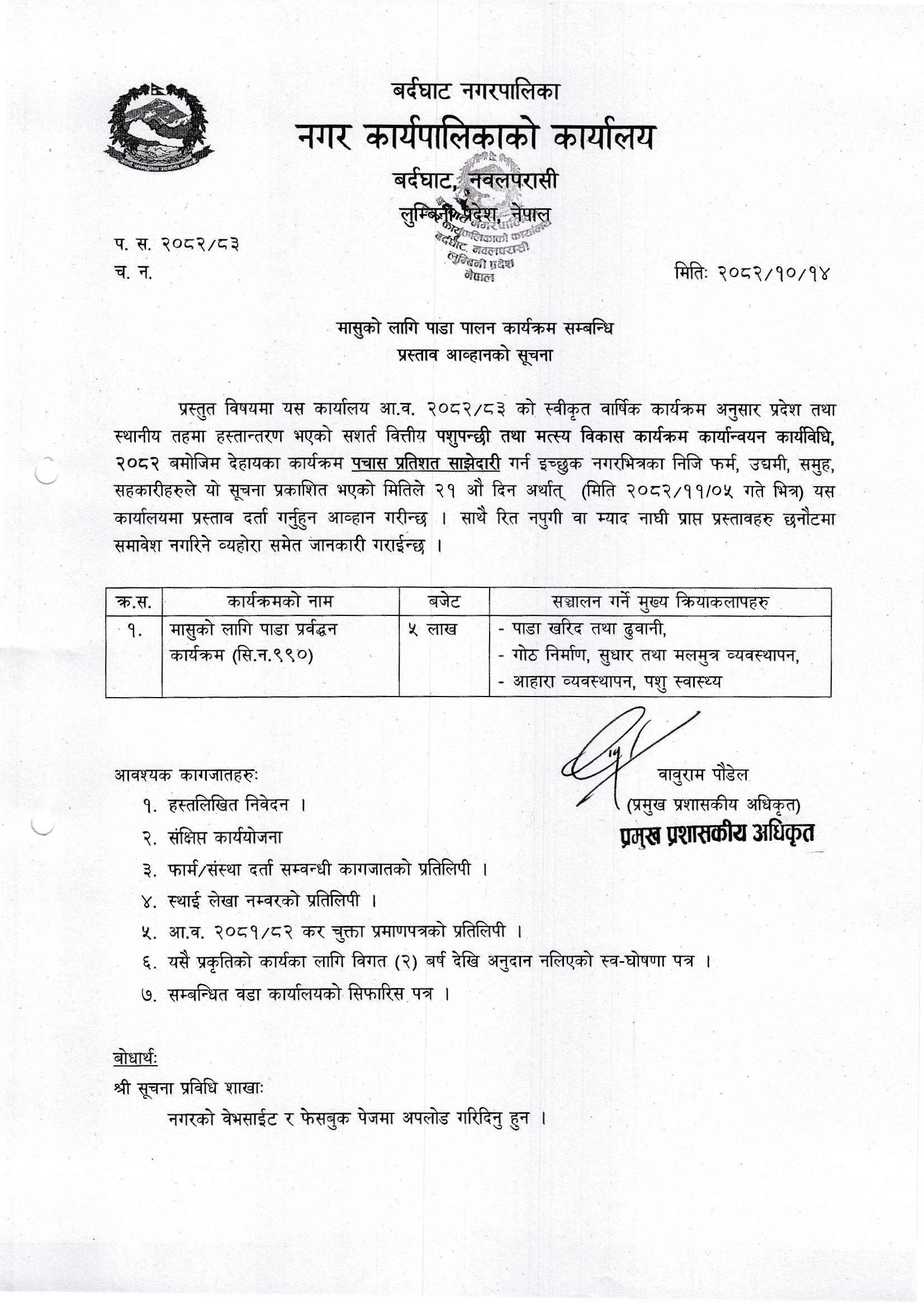 मासुको लागि पाडा पालन कार्यक्रम सम्बन्धि प्रस्ताव आव्हानको सूचना