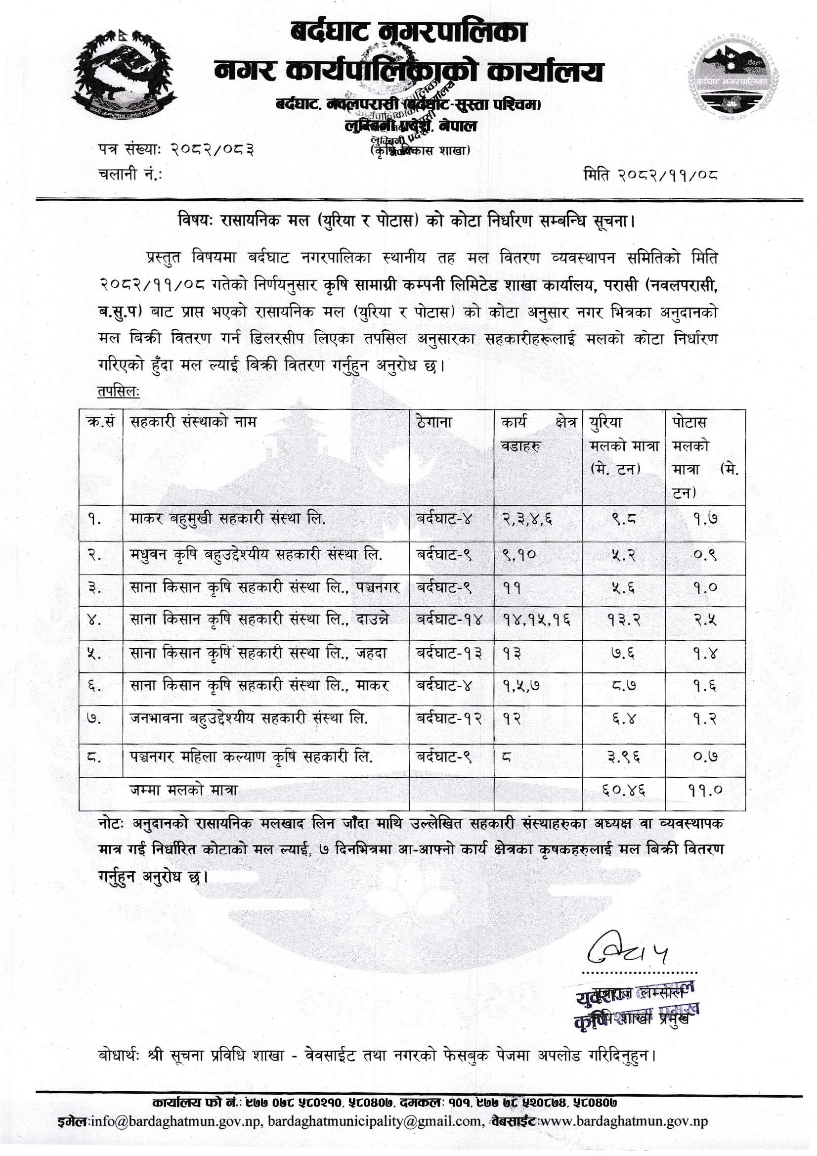 रासायनिक मल (युरिया र पोटास) को कोटा निर्धारण सम्बन्धि सूचना